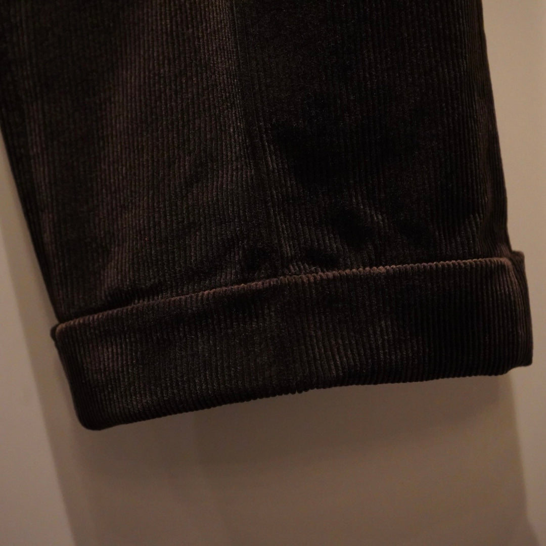 レーヨンを混ぜる事で、光沢感と自然なドレープ性を表現した9Wコーデュロイ素材を使用したクラシカルな趣を醸す裾までストレートなシルエットのインタックトラウザー。特殊加工技術によりパイル立ちが良く柔らかな風合いに仕上げています。